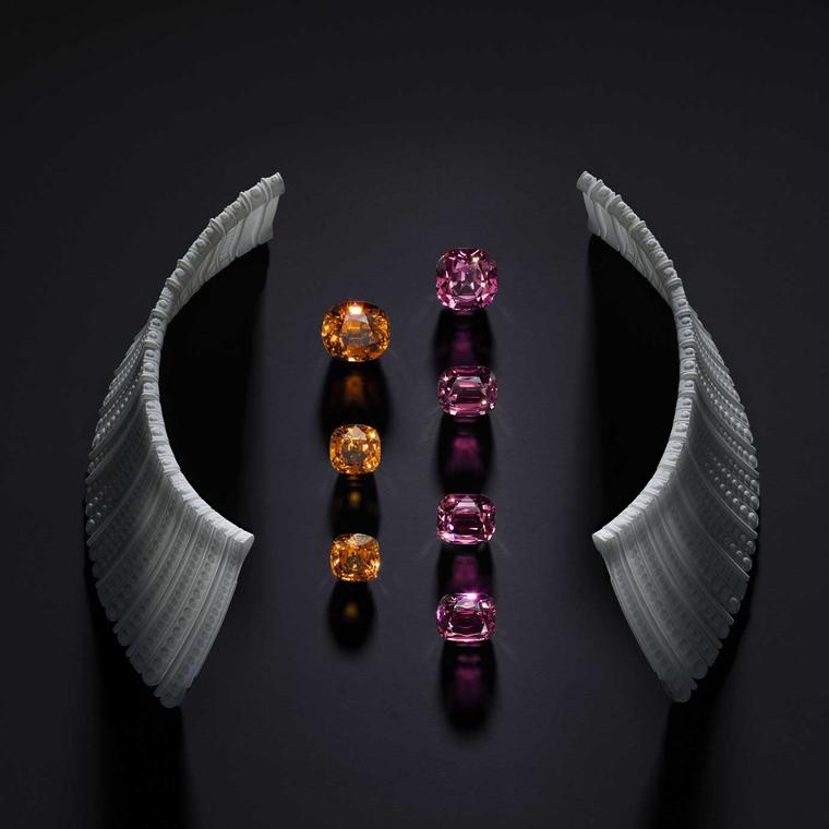 Berry-red rubies and leaf-green emeralds conjure up the proliferation of vegetation in the 'Plants' series. The richness and intricacy of the quality of the sculptural choker, rings, earrings and bracelets conjure up abundant plant life. 'Wings' (above) celebrates the arrival of birds, one of the world's oldest species. Feathery diamond wings wrap around a Mozambique ruby to create the illusion of a bird in flight.
