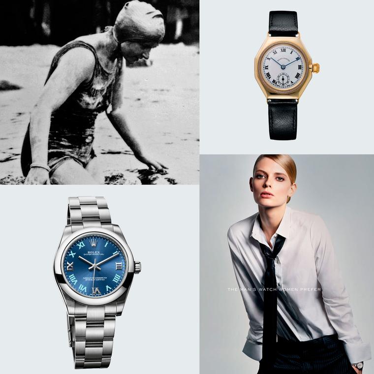 When Hans Wilsdorf, founder of the Rolex watch company, dreamed up the world’s first waterproof watch in 1926, he turned to a woman as his testimonial. Mercedes Gleitze, a swimmer who had made history as the first English woman to swim the Channel in 1927, was chosen as the ideal candidate, and although her second cross-Channel swim of October 1927 was marred by freezing temperatures and fog, the Oyster watch attached on a ribbon around her neck emerged from the icy waters after 10 hours and 15 minutes in perfect working order. Wilsdorf took out a full-page ad in the Daily Mail to publicise the “wonder watch that defies the elements” and show the world that the accuracy and waterproofness were by no means an exclusive male concern.